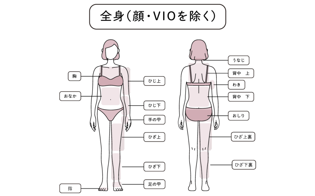 ⚫︎ 顔とVIO以外のパーツを対象にした全身脱毛コースです。「デリケートな部分は除いてケアしたい」という方にぴったりな内容です。